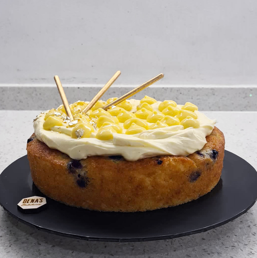 A dense Lemon & Blueberry cake topped with decadent Vanilla Cream Cheese icing & dollops of zesty lemon curd.