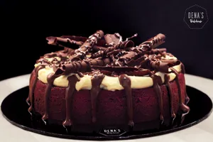 A rich Red Velvet cake topped with decadent Vanilla Cream Cheese icing & drizzled with Belgian dark chocolate. Accented with chocolate curls.